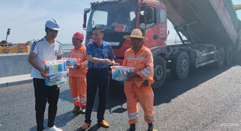 近日持續(xù)高溫、烈日炎炎,S325六安馬頭至長集段新建工程奮戰(zhàn)正酣。項目建設(shè)單位領(lǐng)導(dǎo)關(guān)心一線施工人員的身心健康,7月12日上午,市交通運輸局黨組成員、總工程師程本文等一行到S325項目開展“夏日送清涼”慰問活動,給奮戰(zhàn)在高溫一線的施工人員送來防暑降溫用品,為炎炎夏日下的施工人員帶來一絲“清涼”。
