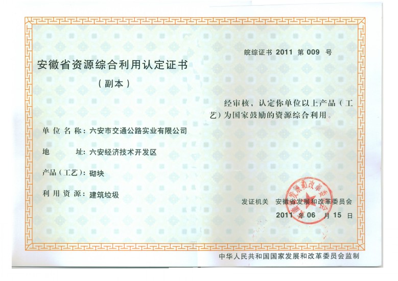 六安市交通公路實業(yè)有限公司在路面大中修中利用瀝青路面冷再生技術(shù)綜合利用廢棄的建筑垃圾,實現(xiàn)了老舊路面固體廢棄物回收再利用。被認(rèn)定為2011年安徽省第一批資源綜合利用企業(yè),省發(fā)改委頒發(fā)《資源綜合利用認(rèn)定證書》。